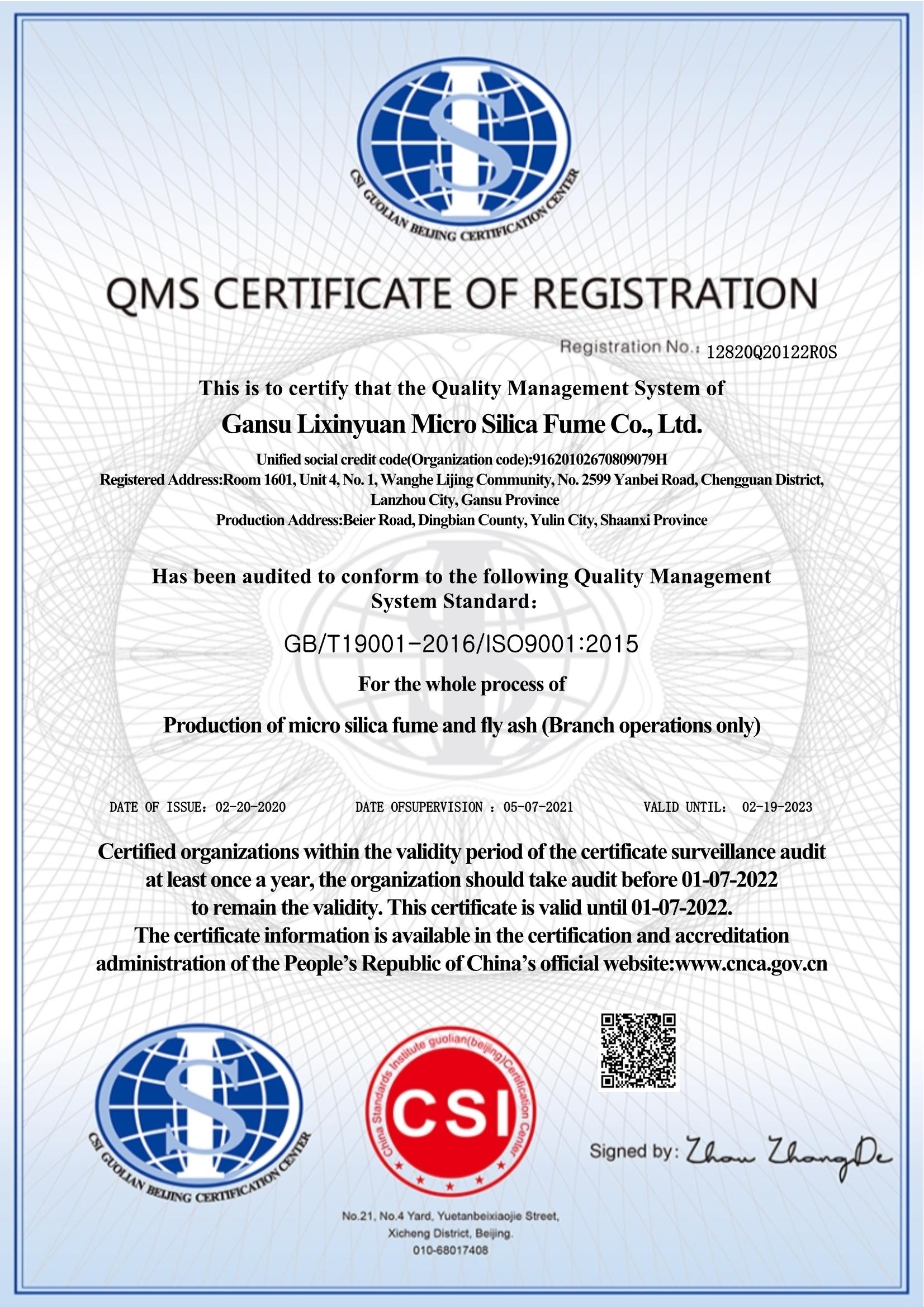 甘肅利鑫源微硅粉有限公司是專業微硅粉生產加工廠家,從事研發高品質微硅粉,以出口為主的科技型企業。自2004年以來,公司專做微硅粉十七年。擁有先進的生產和化驗設備,并通 過了ISO9001:2015質量管理體系認證、ISO145001:2018環境管理體系認證和ISO 45001: 2018職業健康管理體系認證。
